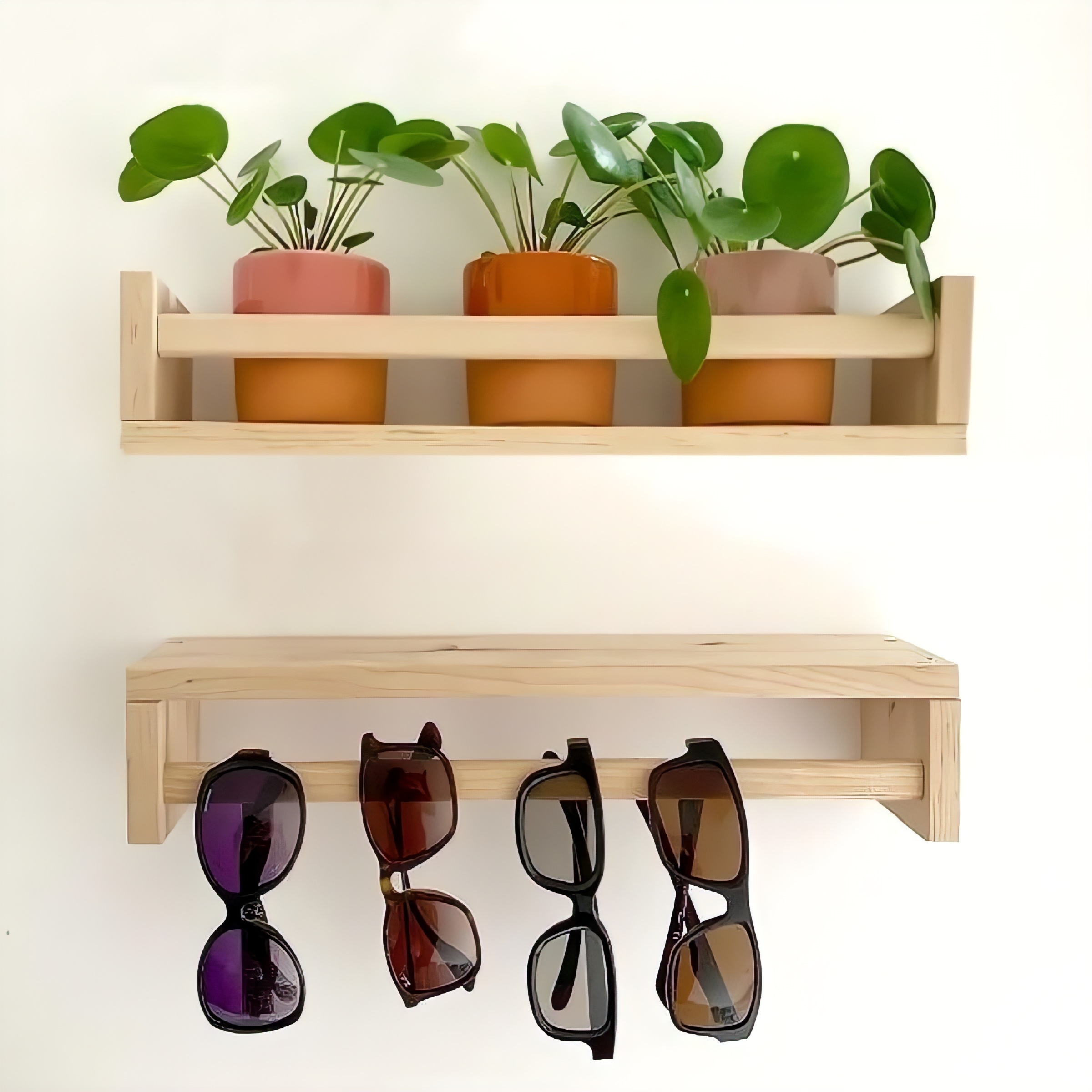 شلف چوبی مینیمال مسترکلاغ – نگهدارنده دیواری برای گلدان و عینک